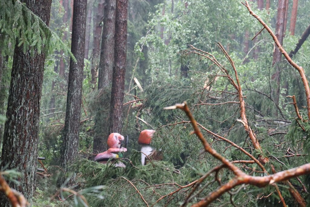 Ļoti spēcīgs negaiss dabas parku sasniedza šodien pirms plkst.12. negaisa laikā dabas parku postījis spēcīgs vējš, sagāžot kokus, bojājot infrastruktūru, tostarp mazos rūķu namiņus, koka skulpūras u.c.