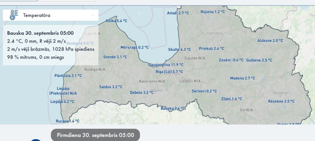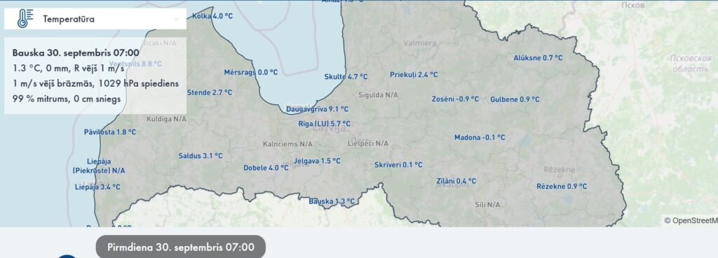 Pirmdienas rītā Latvijas lielākajā daļā gaisa temperatūra pazeminājusies līdz 0..+3 grādiem, liecina Latvijas Vides, ģeoloģijas un meteoroloģijas centra (LVĢMC) dati. Bauskā pulksten 5 reģistrēti plus 2,4 grādi, bet pulksten 7 plus 1,3 grāds.