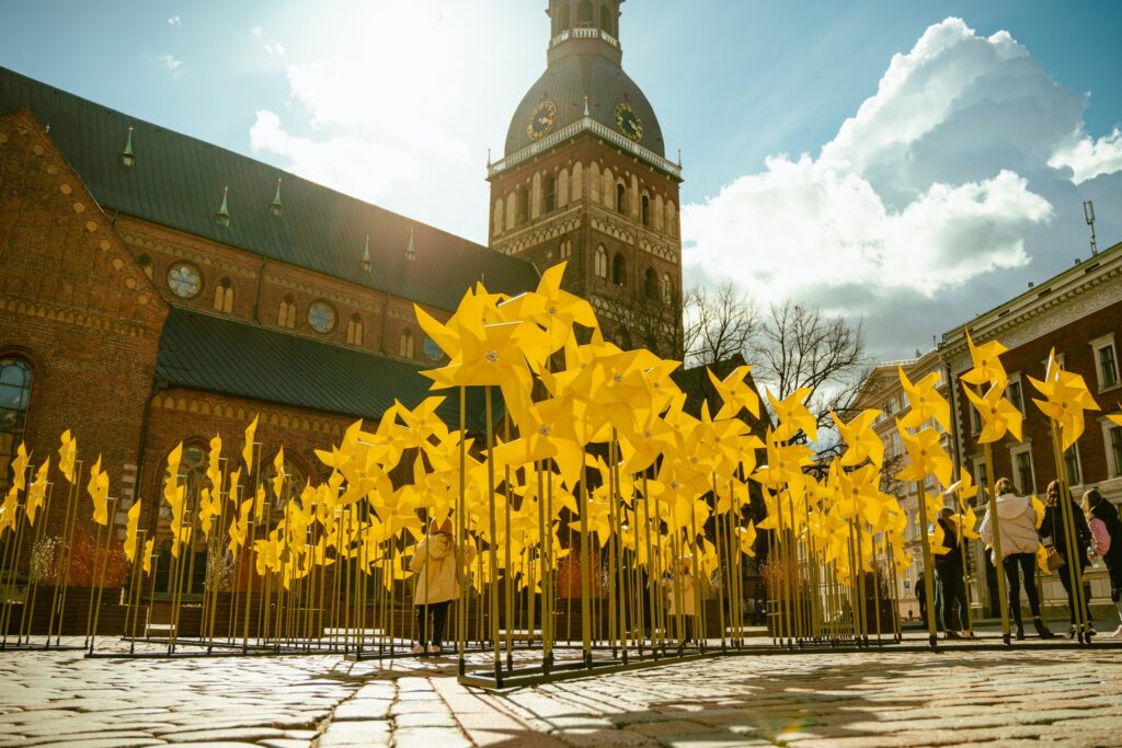 Doma laukumā izveidota centrālā Lieldienu pilsētvides noformējuma ekspozīcija, kurā apskatāma vides dizaina objektu kompozīcija “Saules dzirnas”, atraitnīšu stādījumi, kā arī pavasara augu un zaru kompozīcijas. Savukārt 17. un 18.aprīlī ikvienam būs iespēja izšūpoties divās koka šūpolēs.
