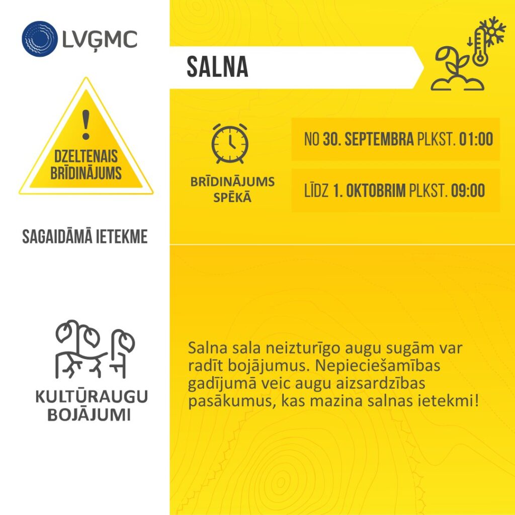Saistībā ar gaidāmo salnu Latvijas Vides, ģeoloģijas un meteoroloģijas centrs (LVĢMC) izsludinājis dzelteno brīdinājumu, kas būs spēkā 30.septembrī no plkst.1 līdz 8.