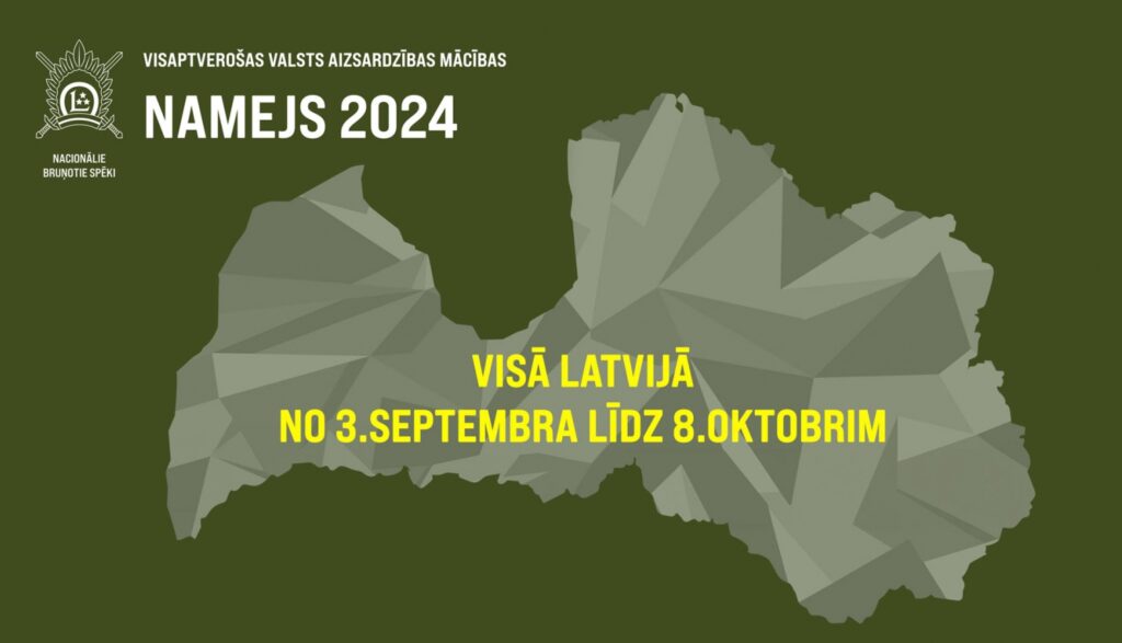 No 3.septembra līdz 8.oktobrim visā Latvijā notiks Nacionālo bruņoto spēku (NBS) organizētās visaptverošas valsts aizsardzības mācības “Namejs 2024”, kurās piedalīsies aptuveni 11 000 Latvijas un sabiedroto karavīru un zemessargu, aģentūru LETA informēja NBS.