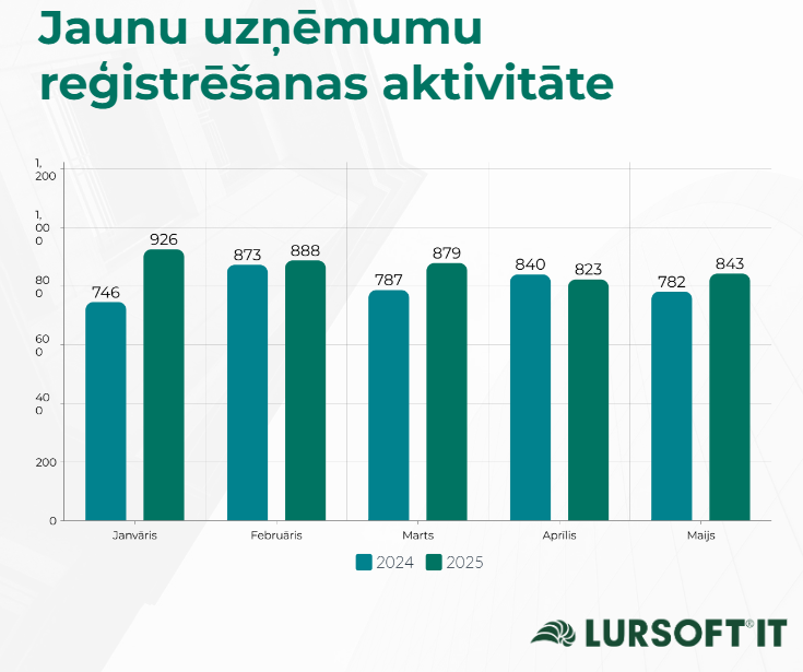 Aizvadītajā mēnesī Latvijā reģistrēti 843 jauni uzņēmumi, to kopējam pamatkapitālam sasniedzot 4,27 miljonus eiro, liecina “Lursoft IT” apkopotie dati. Kopumā šī gada pirmajos piecos mēnešos reģistrēto uzņēmumu skaits, salīdzinot ar 2024. gada attiecīgo periodu, audzis par 8,22%.
