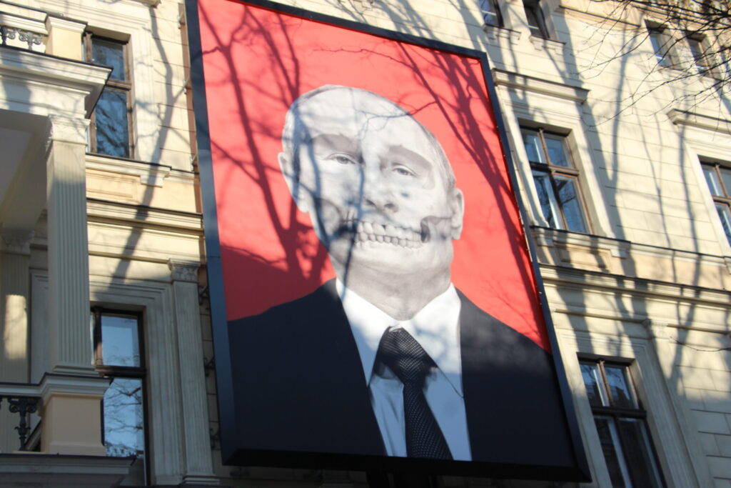 Attēls – plakāts Rīgā, nosodot Krieviju, kas pirms trim gadiem sākusi karu Ukrainā.