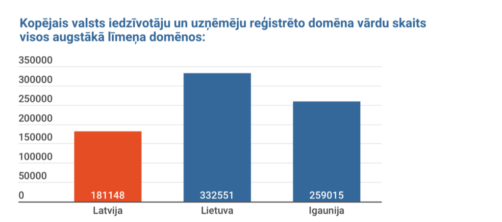Kopā Latvijas uzņēmēji un iedzīvotāji ir reģistrējuši vien 181 148 domēna vārdus (visos paplašinājumos). Tajā pat laikā Lietuvas iedzīvotāji un uzņēmēji ir reģistrējuši 332 551, bet Igaunijas – 259 015 domēna vārdus.