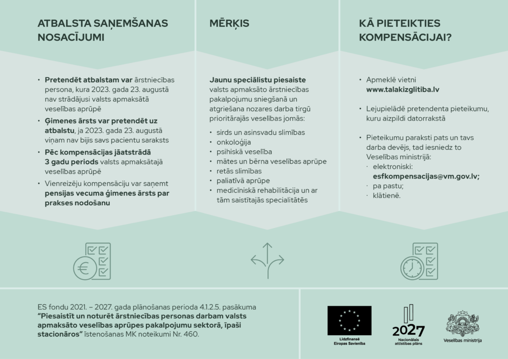 Finanšu atbalsts paredzēts ārstniecības personām par profesionālās darbības sākšanu vai atsākšanu valsts apmaksāto veselības aprūpes pakalpojumu sniegšanā – slimnīcās, Neatliekamās medicīniskās palīdzības dienestā (NMPD), ģimenes ārstu praksēs un citur.