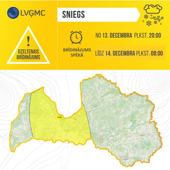 Latvijas Vides ģeoloģijas un meteoroloģijas centrs informē, ka sestdienas vakarā Latviju no rietumiem sasniegs plaša nokrišņu zona. Meteorologi brīdina, ka naktī uz svētdienu rietumu un centrālajos rajonos gaidāma stipra snigšana – vietām izveidosies 5 centimetru bieza sniega sega.