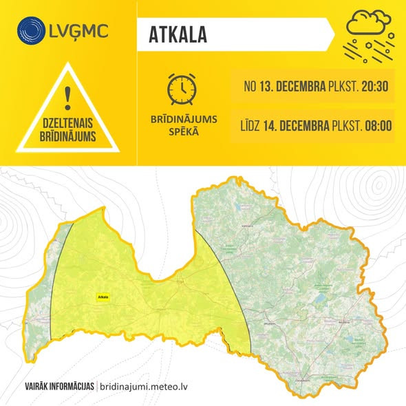 Nokrišņu zonai turpinot šķērsot Latvijas teritoriju, naktī gaidāms ne vien sniegs, bet arī sasalstošs lietus- atkala. Naktī atkala gaidāma vietām valsts rietumu un centrālajos rajonos, dienā arī valsts austrumos. Satiksmes dalībnieki aicināti būt uzmanīgiem –atsevišķi ceļu posmi būs slideni!
