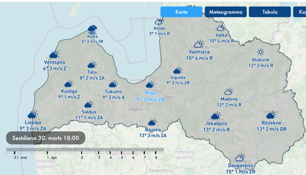 Sinoptiķi prognozē, ka svētdien gaisa temperatūra Latvijā sasniegs +21 grādu. Līdz šim augstākā gaisa temperatūra, kas valsts teritorijā reģistrēta pavasara pirmajā mēnesī, ir +20,8 grādi 1968.gada 30.martā Mērsragā. Savukārt 31.marta nacionālais siltuma rekords ir +19,1 grāds, kas reģistrēts 2010.gadā Rucavā.