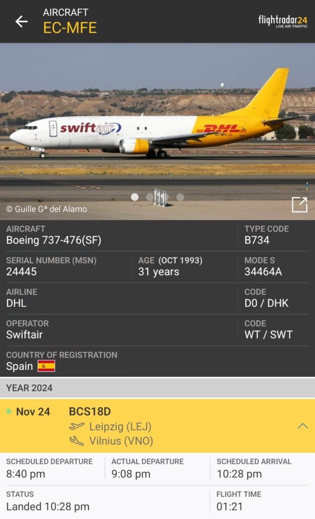 Pirmdien, 25. novembrī, ap plkst. 5:28 Ugunsdzēsības un glābšanas departaments saņēmis informāciju par ugunsgrēku dzīvojamā mājā. Viļņas reģiona policija ziņoja, ka uz ēkas nokritusi kravas lidmašīna.