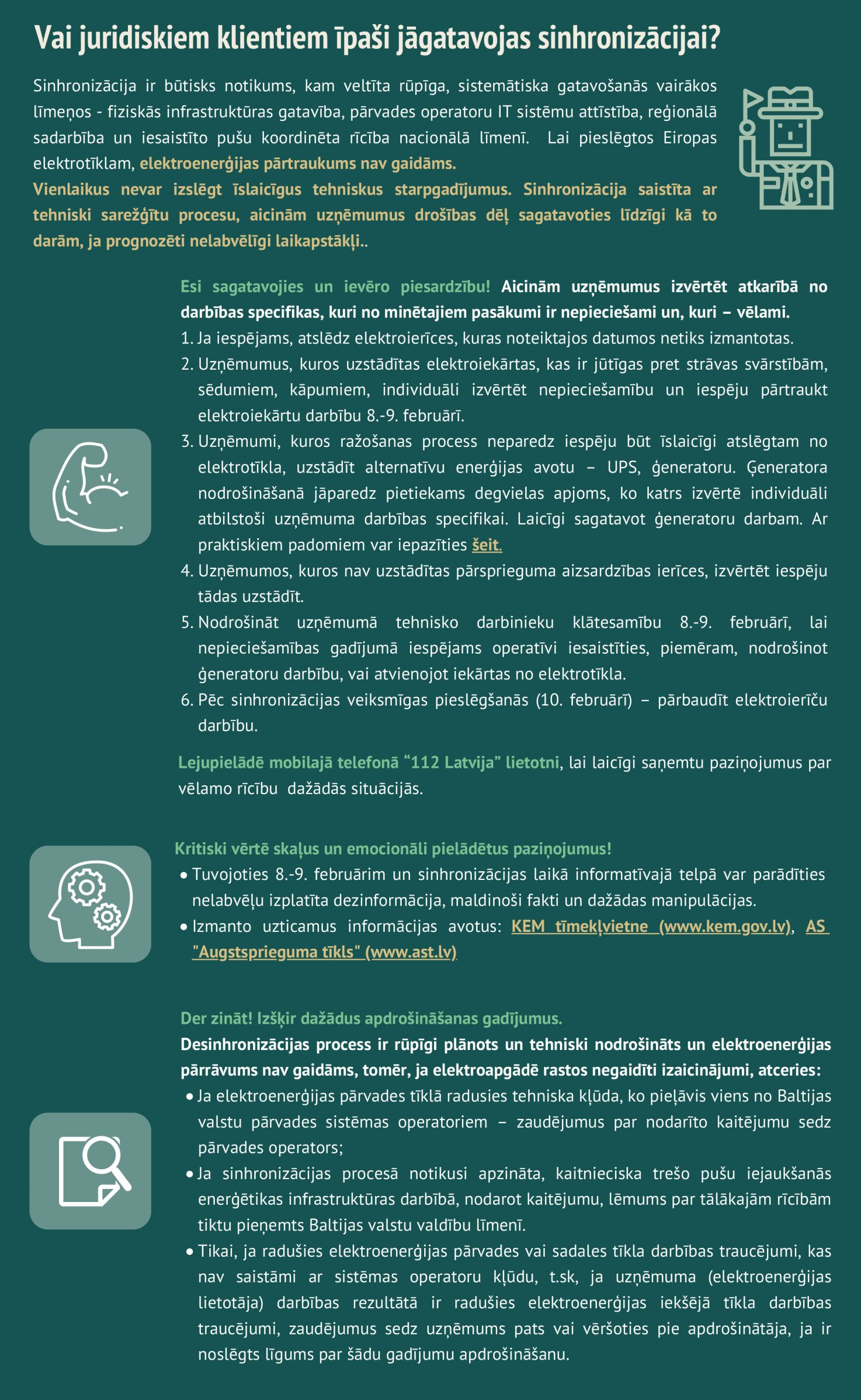 Vienlaikus elektroapgādes traucējumus pilnībā izslēgt nav iespējams, jo sinhronizācija saistīta ar tehniski sarežģītu procesu. Elektroapgādes traucējumi ir iespējami jebkuros apstākļos. Tos var izraisīt gan ārēja ietekme, piemēram, vētras, gan tehnoloģiski traucējumi Latvijas vai kaimiņvalstu pārvades sistēmās. Elektroapgādes traucējumu iespējamība sinhronizācijas dēļ nav būtiski augstāka, kā ikdienā, piemēram, nelabvēlīgu laikapstākļu radīto postījumu dēļ. Aicinām iedzīvotājus iepazīties ar informatīvo materiālu – par būtiskāko, kas attiecas uz sinhronizācijas projektu un, kam jāpievērš uzmanība?