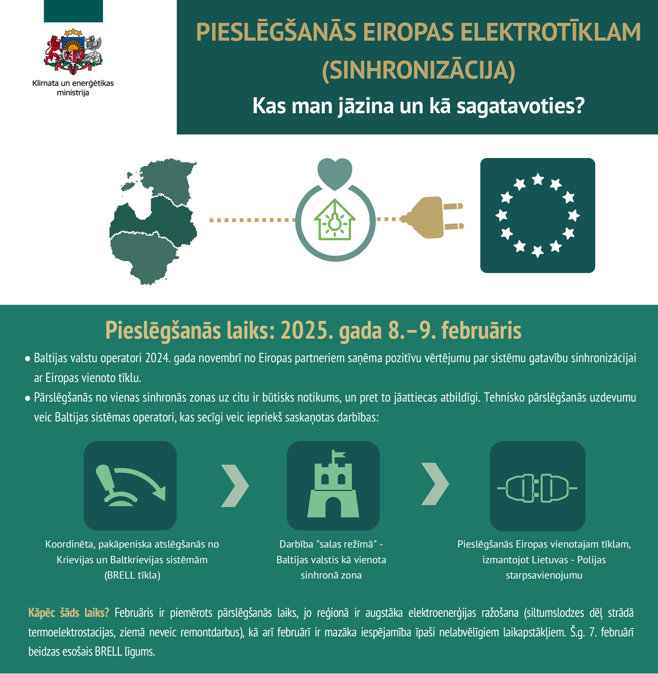 No 8. līdz 9. februārim Baltijas valstis atvienosies no Krievijas energosistēmas un pievienosies kopējam Eiropas energotīklam, kas pēc ģenerācijas ir trīs reizes lielāka par Krievijas energosistēmu. Šis ir vērienīgākais energoneatkarības un reģiona drošības projekts, ko kopīgi īsteno Baltijas valstu elektroenerģijas pārvades sistēmas operatori – Latvijas (AS “Augstsprieguma tīkls”), Igaunijas, Lietuvas. Baltijas valstis ir gatavas pievienoties Eiropas energosistēmai, projektā ieguldot lielu darbu 15 gadu garumā, lai pievienošanās noritētu sekmīgi, nodrošinot stabilu elektroapgādes sistēmas darbību, ziņo Klimata un enerģētikas ministrija.
