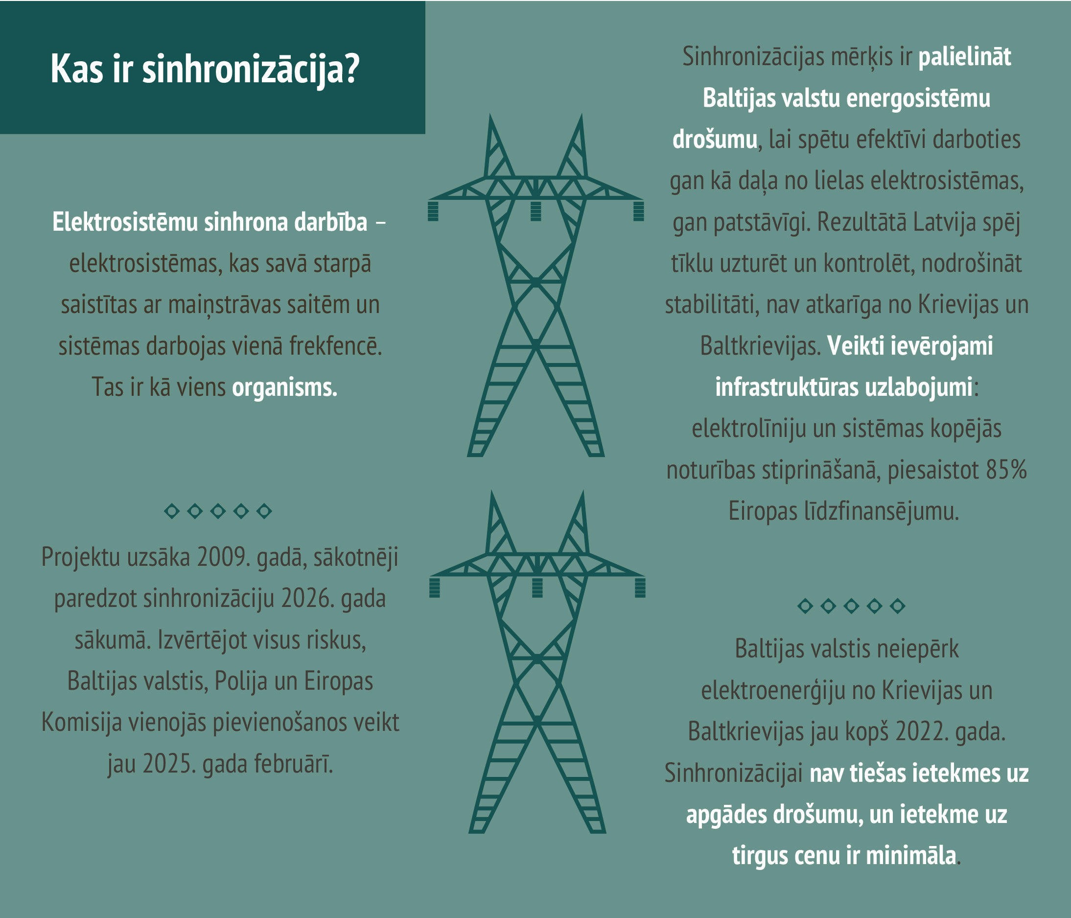 “Sinhronizācija vērsta uz to, lai mēs paši spētu uzturēt un kontrolēt elektroapgādes tīklu, nodrošināt stabilitāti un nebūtu atkarīgi no kaimiņu darbībām. Lai nodrošinātu kvalitatīvas informācijas pieejamību par vērienīgāko neatkarības projektu Baltijā, rīkojam virkni diskusiju ar sadarbības partneriem un citu ministriju resoriem, kurā skaidrojam sinhronizācijas projekta būtību. Tiesa gan, sarežģītos ģeopolitiskos apstākļos sabiedrības ievainojamība ir augstāka, un jo tuvāk nāk noliktais sinhronizācijas projekta noslēguma datums, jo biežāk mēs saskaramies ar maldinošu informāciju. Aicinām sabiedrību kritiski izvērtēt informāciju un neuzķerties uz emocionāli pielādētiem, nepamatotiem paziņojumiem, kā arī nedalīties tālāk ar nepārbaudītām ziņām. Aktuālai informācijai aicinu sekot līdzi KEM, AST tīmekļvietnēs,” uzsver klimata un enerģētikas ministrs Kaspars Melnis.