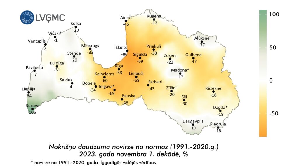 Vidējais nokrišņu daudzums Latvijā novembra pirmajā dekādē bija 18,2 milimetri jeb 84% no daudzu gadu vidējā lieluma. Visvairāk nokrišņu – 60,6 milimetri – bija Rucavā, bet vismazāk lija Zvejniekciemā, kur reģistrēti tikai 2,7 milimetri nokrišņu.