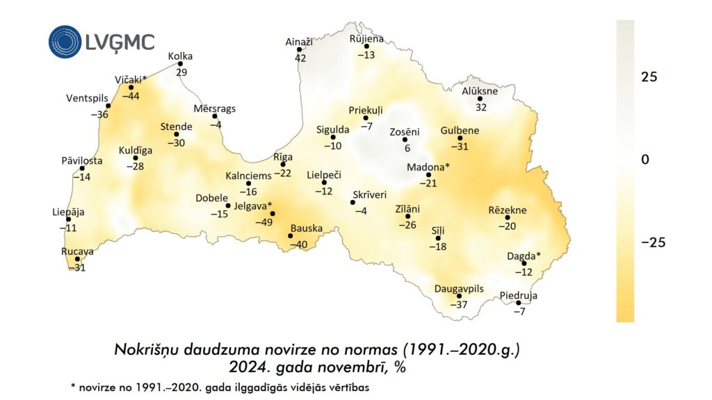 Sausuma un mitruma rādītājs gandrīz visās novērojumu stacijās novembrī bija normas robežās. Jelgavas novērojumu stacijā novembris bija mēreni sauss, savukārt Kolkā, Ainažos un Alūksnē – mēreni vai ļoti mitrs.