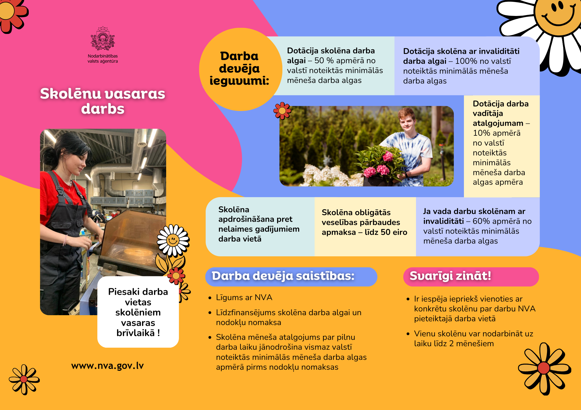 Nodarbinātības valsts aģentūra (NVA) jūnijā, jūlijā un augustā organizēs vasaras nodarbinātību skolēniem vecumā no 15 līdz 20 gadiem (ieskaitot), kuri iegūst izglītību vispārējās, speciālās vai profesionālās izglītības iestādēs. Līdz 19. aprīlim NVA visā Latvijā pieņem darba devēju pieteikumus skolēnu nodarbinātībai. Šogad darba devējam pieteikums pasākuma īstenošanai ir jāiesniedz digitāli, vakances skolēnu vasaras darbam piesakot NVA CV un vakanču portālā cvvp.nva.gov.lv.