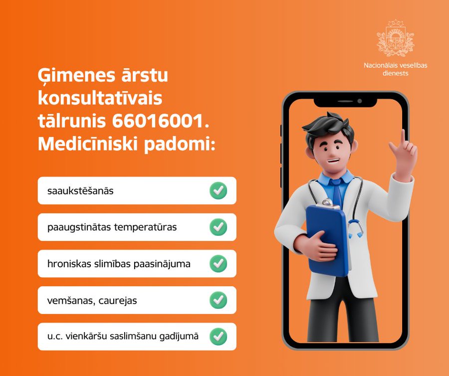 NVD atgādina, ka vieglu saslimšanu gadījumā, piemēram, saaukstēšanās, kakla sāpju, neliela drudža, gremošanas traucējumu vai hronisku slimību paasinājuma gadījumā, iedzīvotāji var saņemt mediķu padomu, zvanot uz Ģimenes ārstu konsultatīvo tālruni 66016001. Konsultatīvā tālruņa speciālisti palīdzēs izvērtēt situāciju un ieteiks turpmāko rīcību, tostarp vai nepieciešama klātienes vizīte pie ārsta.