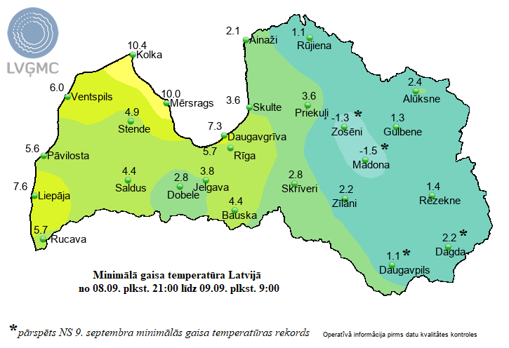 Piektdienas rītā zemākā gaisa temperatūra Latvijā bija -1,3 grādi Zosēnos un -1,5 grādi Madonā, un tas ir jauns 9.septembra aukstuma rekords visas valsts mērogā, liecina Latvijas Vides, ģeoloģijas un meteoroloģijas centra (LVĢMC) dati.