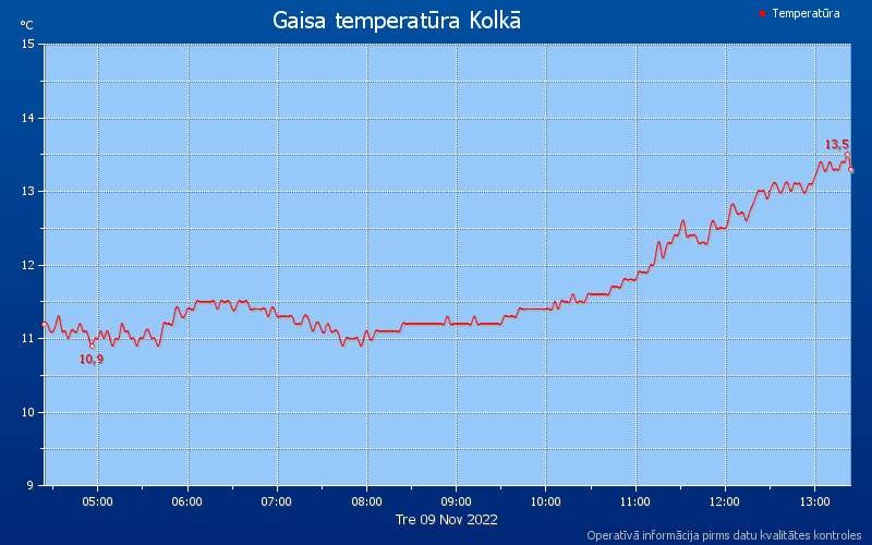Trešdien plkst.13 gaisa temperatūra Kolkā bija +13,2 grādi, un tas ir jauns 9.novembra siltuma rekords visas valsts mērogā, liecina Latvijas Vides, ģeoloģijas un meteoroloģijas centra dati.