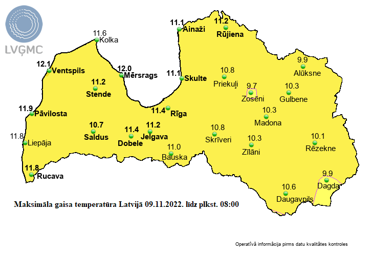9.novembra siltuma rekords naktī pārspēts šādās meteoroloģiskajās stacijās – Ainažos, Dobelē, Jelgavā, Mērsragā, Pāvilostā, Rīgā, Rucavā, Rūjienā, Saldū, Skultē, Stendē un Ventspilī.