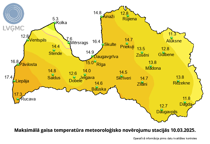 Līdz plkst.14 augstākā gaisa temperatūra bija +17,1 grāds Liepājā. Tik silts laiks marta pirmajā pusē Latvijā novērots pirmo reizi. Iepriekšējais rekords bija +15,5 grādi 2014.gada 10.martā Dobelē.