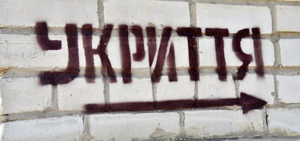 Ukrainā patvertņu norādes zīmēm, protams, tūkstošus netērē. Foto: Uldis Varnevičs.