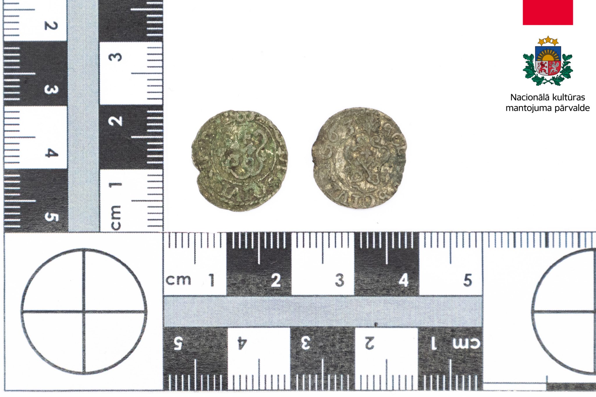 Kopumā atradumu veido desmit senlietas – deviņas monētas un viens no sudraba šiliņa izgatavots monētpiekariņš. Vairums monētu datējamas ar 1662. – 1665.gadu un kaltas Rīgā, Zviedrijas valdnieku Kārļa XI un Kārļa Gustava valdīšanas laikā, bet viens vara solīds Žečpospolitas valdnieka Jana Kazimira II Vāsas valdīšanas laikā kalts Viļņā. Nedaudz vecāks ir atrastais Rīgas brīvpilsētā kaltais šiliņš – datējams ar 1575.gadu. Uz šiliņa aversā attēlots Rīgas pilsētas ģerbonis – pilsētas vārti ar diviem torņiem un lauvas galvu vārtos, ģerboni aptver leģenda CIVITATIS RIGENSIS (latv. Rīgas pilsētas). Reversā redzams Rīgas pilsētas mazais ģerbonis – sakrustotas pilsētas atslēgas virs kurām krusts ar ciparu 7 kreisajā pusē un ciparu 5 labajā pusē, kuru aptver leģenda MONE NOVA ARGENTEA (latv. Jaunā sudraba monēta). Savukārt monētpiekariņš izgatavots no monētās, kas datējama ar laiku no 1509. – 1524.gadam un ir Livonijas ordeņa mestra Valtera fon Pletenberga un Rīgas arhibīskapa Jaspera Lindes kopkalums. Monētas aversā centrā aplī redzams Valtera fon Pletenberga dzimtas ģerbonis, bet reversā centrā aplī esošais attēls, kurā vajadzētu būt Jaspera Lindes dzimtas ģerbonim – vairogam ar liepu centrā, korozijas dēļ nav saskatāms.
