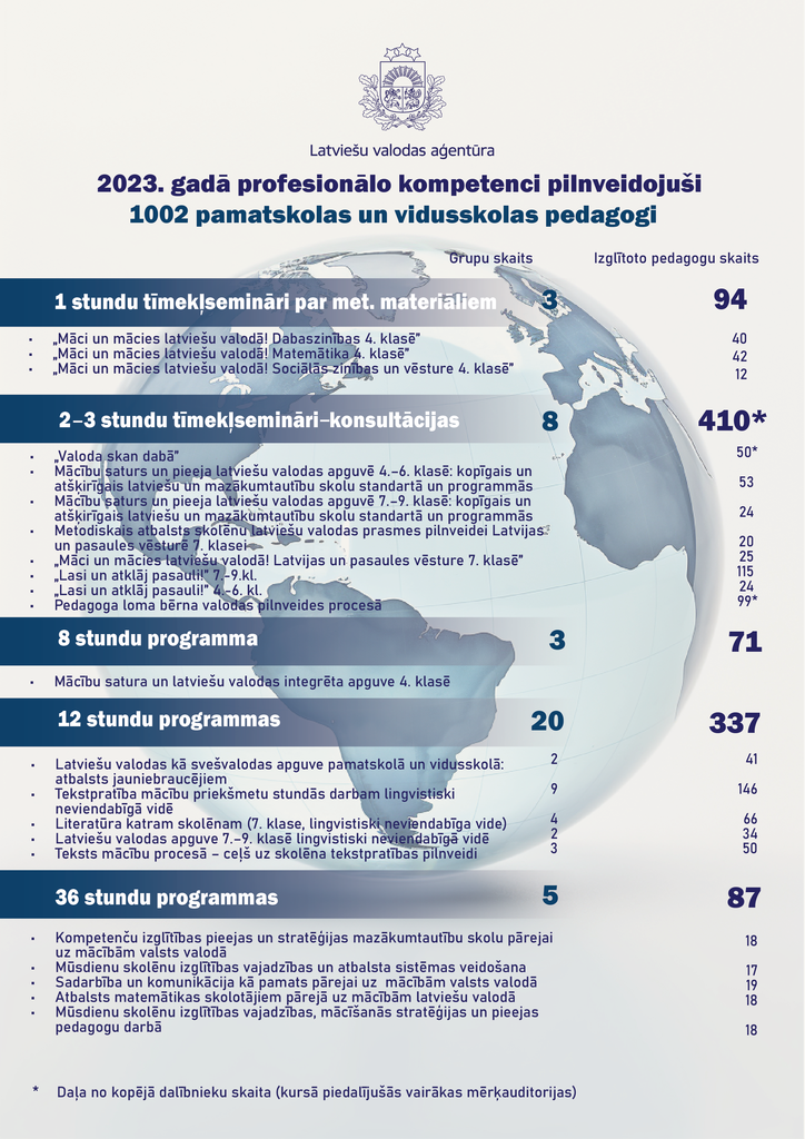 Profesionālo kompetenci pilnveidojuši 1002 pamatskolas un vidusskolas pedagogi. Lielākoties skolotāji izvēlējušies piedalīties divu līdz trīs stundu tīmekļsemināros-konsultācijās un 12 stundu programmās par darbu lingvistiski neviendabīgā vidē. Mazāk apmeklētas 36 stundu programmas, tostarp par kompetenču izglītības pieejām pārejai uz mācībām valsts valodā, atbalsta sistēmas veidošanu un mūsdienu skolēnu izglītības vajadzībām.