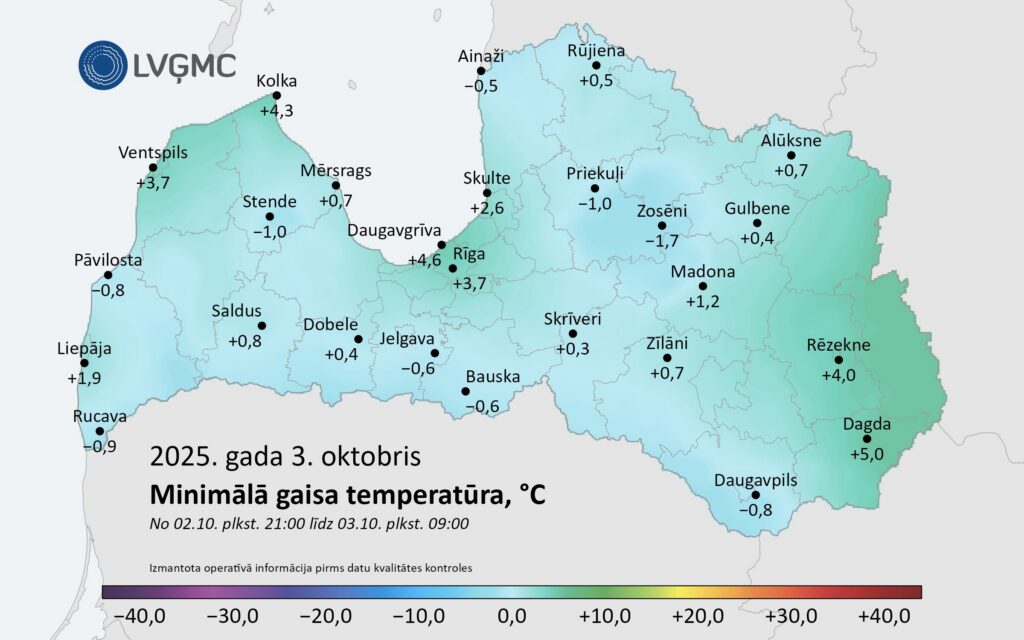 Gaisa temperatūra LVĢMC novērojumu tīklā plkst.5 bija no -0,7 grādiem Zosēnos līdz +6,0 grādiem Kolkā.