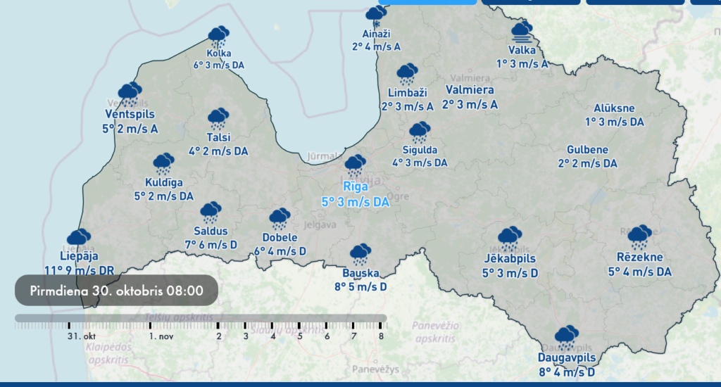 Rīgā dūmaka un lietus, brīžiem gaidāms stiprs lietus. Pūš dienvidaustrumu vējš četri metri sekundē, gaisa temperatūra +3 grādi.