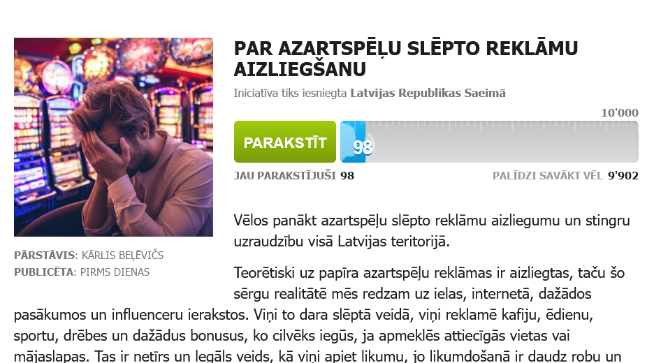 Iedzīvotāju līdzdalības platformā “ManaBalss.lv” ir publicēta jauna iniciatīva “Par azartspēļu slēpto reklāmu aizliegšanu”, kuras autors Kārlis Beļēvičs aicina uz stingrāku kontroli un aizliegumiem pret maskētu azartspēļu reklāmu: https://manabalss.lv/par-azartspelu-slepto-reklamu-aizliegsanu/show
