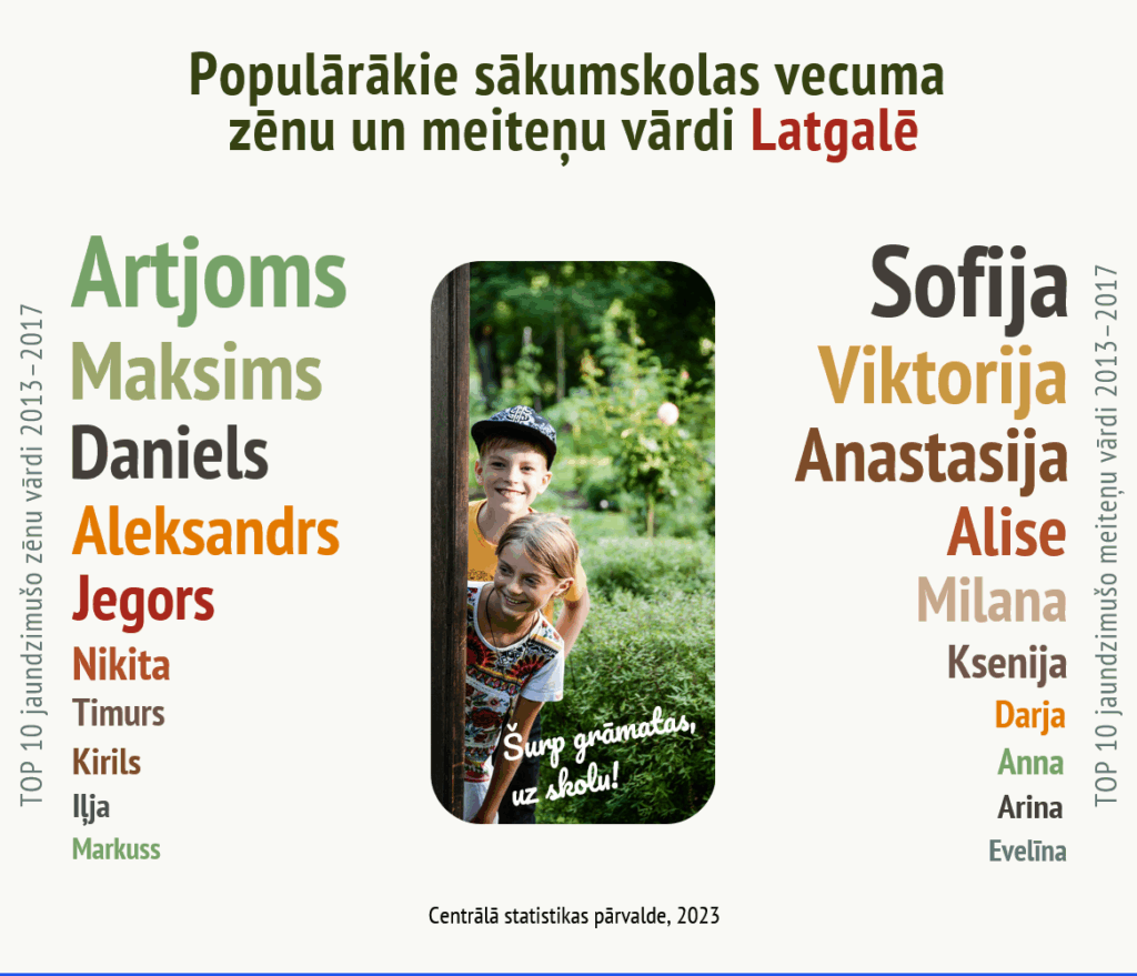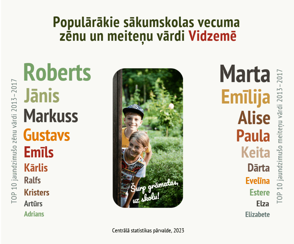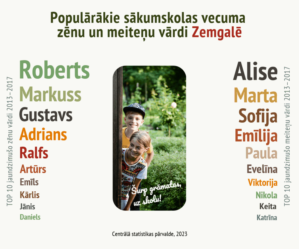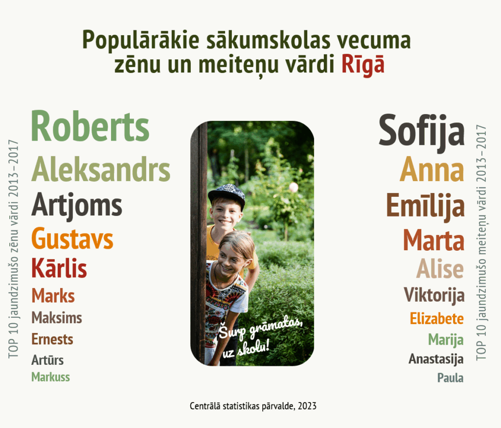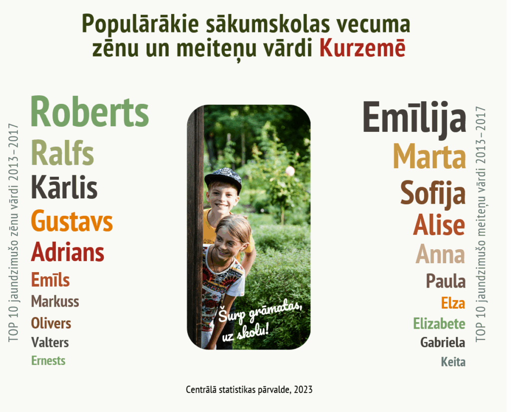 Centrālā statistika pārvalde apkopojusi populārākos sākumskolas vecuma (1. – 4. klase) meiteņu un zēnu vārdus Latvijā un reģionos.
