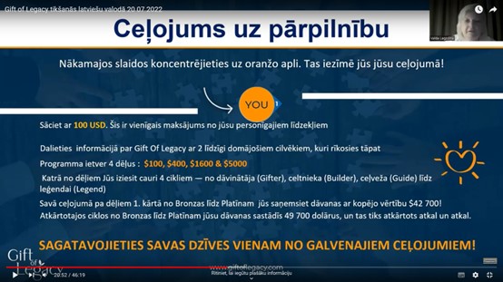 Viņa pastāstīja, ka “YouTube” platformā izplatīts aicinājums iesaistīties piramīdveida shēmā “Gift of Legacy“, solot līdz pat 42 700 dolāru lielu peļņu, sākotnēji investējot (dāvinot) 100 dolārus. Videomateriālā izskaidrota shēmas būtība – “dāvinot” 100 dolārus un piesaistot vismaz divus jaunus “dāvinātājus”, jaunais dalībnieks nonāk nākamajā kārtā, savukārt brīdī, kad katrs no piesaistītajiem “dāvinātājiem” atkal būs atradis vismaz divus “dāvinātājus”, dalībnieks nonāk tālāk nākamajā kārtā.