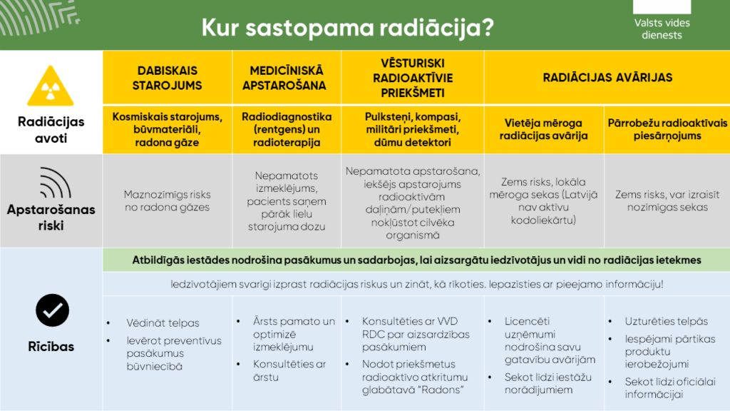 VVD RDC informē – radioaktīvus priekšmetus par maksu var nodot radioaktīvo atkritumu glabātavā “Radons”, Baldones pagastā, Ķekavas novadā, ko apsaimnieko VSIA LVĢMC (tālr.: 67032620, 67032665, e- pasts: klientu.serviss@lvgmc.lv). Ja ir aizdomas par radioaktīva priekšmeta atrašanu, iedzīvotāji aicināti sazināties ar VVD (tālr.: 26338800, e-pasts: okc@vvd.gov.lv), kur Radiācijas drošības centrs sniegs konsultāciju par priekšmeta atpazīšanu un aizsardzības pasākumiem.
