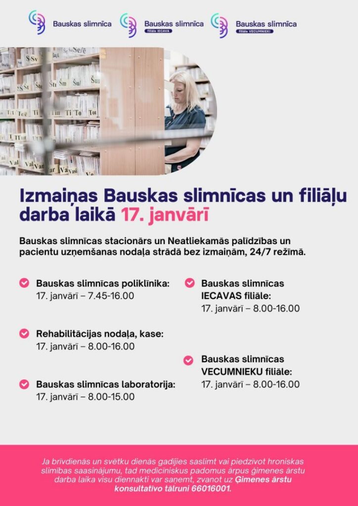 Sestdien, 17.janvārī, strādās arī Bauskas slimnīca un tās filiāles Iecavā un Vecumniekos. Tomēr darba laikā ir izmaiņas, ko slimnīcas administrācija aicina ievērot, plānojot vizīti.