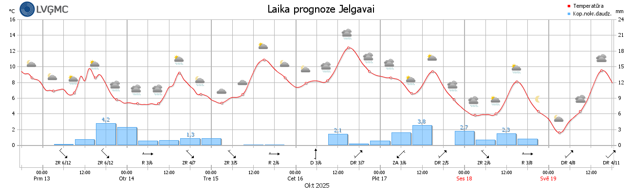 Otrdien mākoņi palaikam atnesīs lietu, bet vietām debesis skaidrosies un uzspīdēs saule. Naktī uz otrdienu atsevišķos rajonos veidosies migla, kas dažviet saglabāsies arī no rīta. Trešdien būs lielākoties mākoņains laiks un vietām gaidāms lietus. Pūtīs lēns līdz mērens ziemeļrietumu, rietumu vējš, kas otrdien jūras piekrastē pūtīs mēreni stipri, naktī uz otrdienu brāzmās sasniedzot 15-16 m/s. Šajās naktīs gaiss atdzisīs līdz +2…+6 grādiem, Kurzemes piekrastē mazliet siltāks, tur +7…+9 grādiem. Dienās gaisa temperatūra paaugstināsies līdz +6…+12 grādiem.