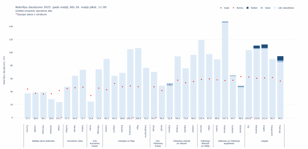 Latvijā vidēji nokrišņu daudzums 1.-25.maijā sasniedza 74,3 milimetrus, kas šo mēnesi var padarīt par 10.-14.mitrāko novērojumu vēsturē. Lietainākais maijs bija 1928.gadā, kad vidējais nokrišņu daudzums valstī sasniedza 117 milimetrus, otrajā vietā ierindojas 1926.gada maijs, kad valstī vidēji nolija 100 milimetri nokrišņu, bet trešais mitrākais maijs aizvadīts 1944.gadā – togad nokrišņu daudzums Latvijas teritorijā bija vidēji 95 milimetri.