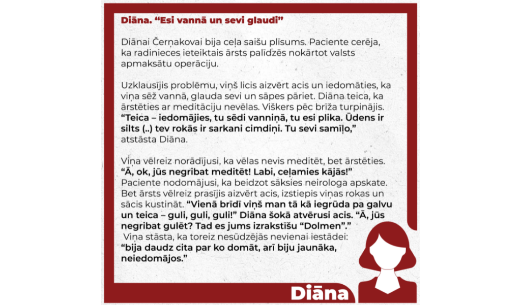 Ārstu viņa iepriekš nepazina. Sieviete stāsta, ka, pavirši uzklausījis sūdzības, neirologs aicinājis apgulties uz kušetes. “Izkrakšķinājis” muguru, vaicādams, vai mājās neesot neviena, kas to izdara. Tad licis piecelties un aizvērt acis. Vienu roku uzlicis viņai uz pieres, otru uz muguras. Apļveida kustībām sācis masēt pieri un muguru.