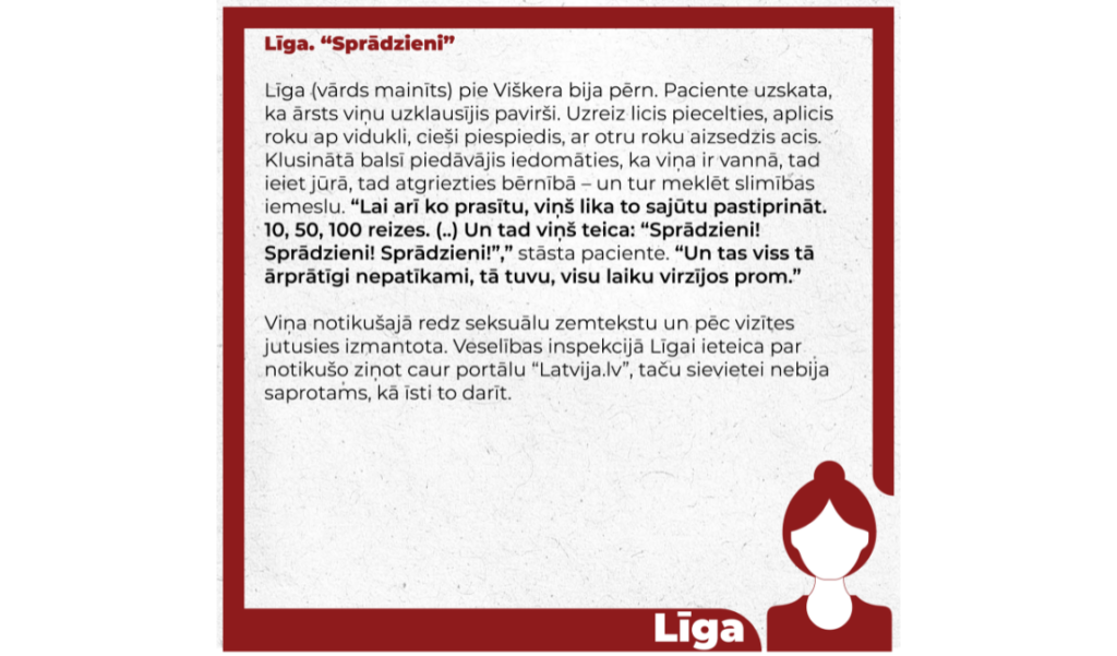 Sieviete jutusies sastingusi, jo, pirmkārt, uzskatīja ārstu par draugu. Otrkārt, baidījusies, ka, ja viņai tiešām būs biedējošā slimība, ārsta palīdzību vajadzēs. Lai gan pagājis vairāk nekā gads, Anna par notikušo domājot gandrīz katru dienu un jūtas izvarota.
