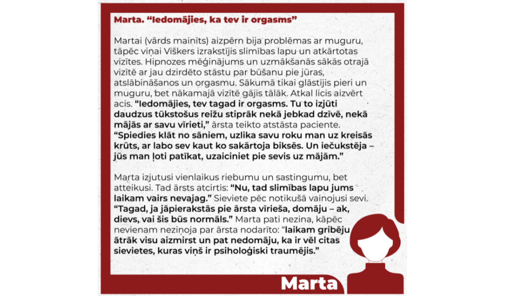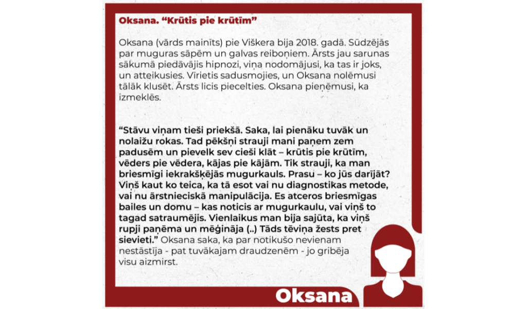 Baltijas pētnieciskās žurnālistikas centrs “Re:Baltica” atklājis un apkopojis vairāku savstarpēji nesaistītu sieviešu pieredzes stāstus par dažādos laikos notikušām vizītēm pie Viškera:
