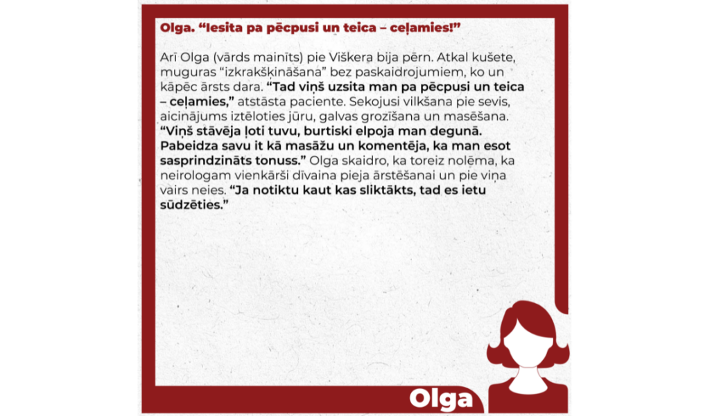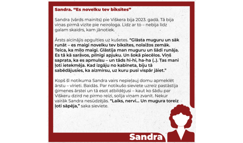 Vairums sieviešu, ar kurām runāja Re:Baltica, par neirologa kabinetā pieredzēto nevienam neziņoja, jo vēlējās to ātrāk aizmirst. Taču divas – Anna un Aleksandra – vērsās atbildīgajās iestādēs.
