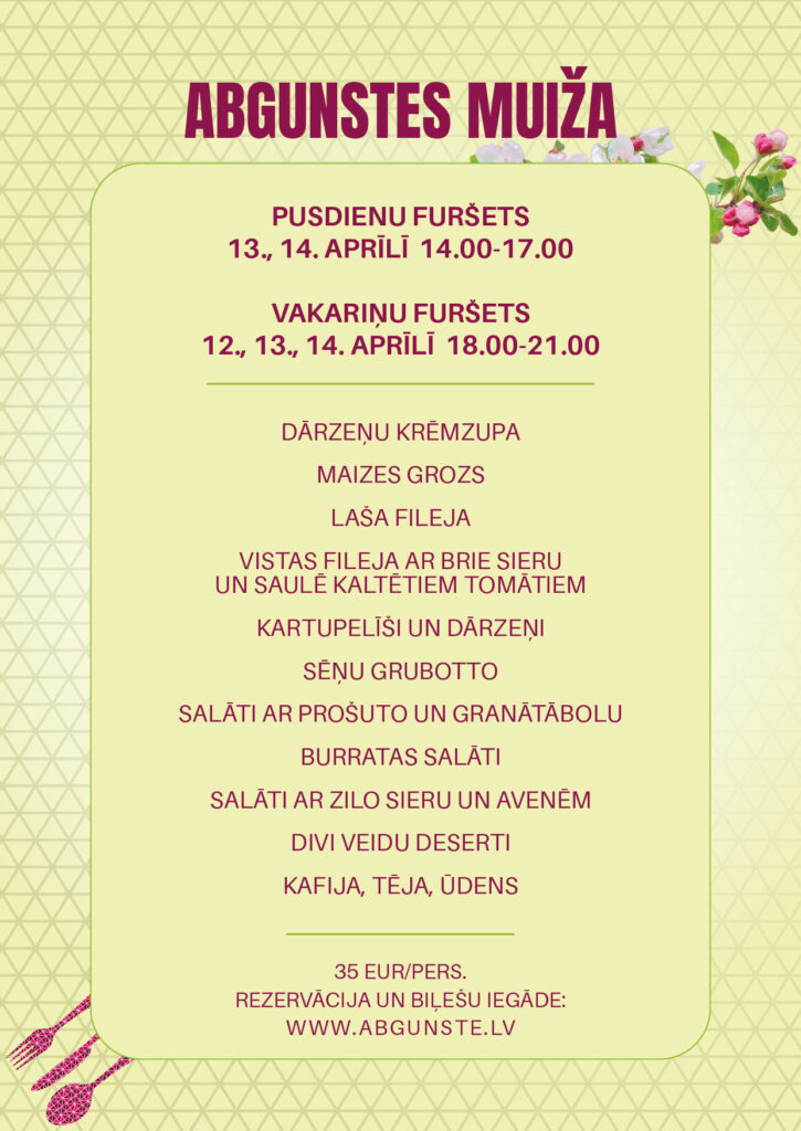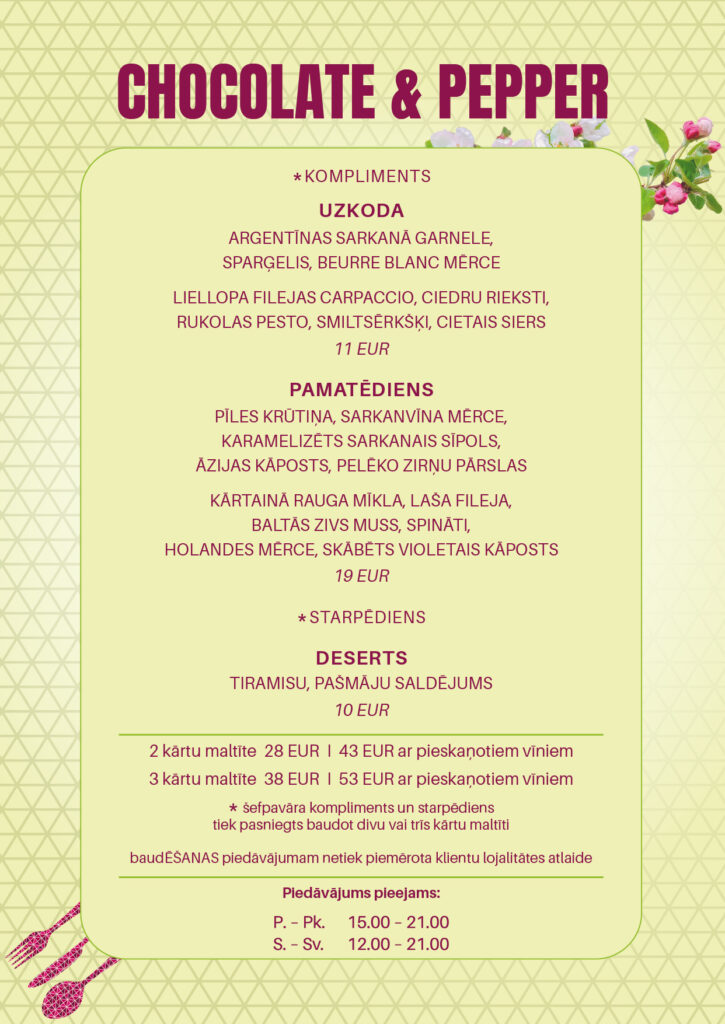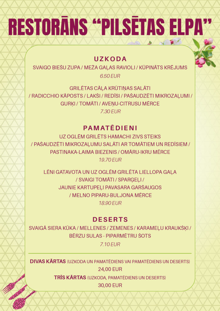 Gardēžiem būs iespēja nobaudīt pavasara dārza salātus ar grilētu vistu un plūškoka mērci, avokado tartaru ar vēžu astītēm, Argentīnas sarkano garneli ar sparģeļiem un Beurre blanc mērci, grieķu jogurta – gurķu auksto zupu, gambo zupu, gaisīgu spinātu-skābeņu musu, karamelizētu riekstu vafeli ar ananāsiem, citrusaugļiem un biezpiena krēmu, rabarberu musu un daudzus citus gardumus.