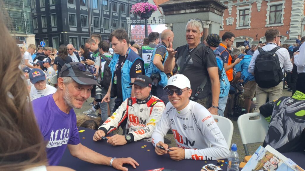 Attēlā – svinīgais pasākums startam FIA pasaules rallija čempionāta Latvijas posmā Rīgā – Latvijas pilots Mārtiņš Sesks un stūrmanis Renārs Francis. Foto autore: Ingrīda Punka