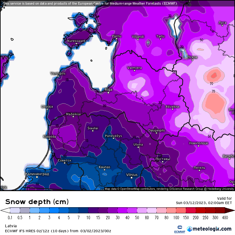 Kopš piektdienas vakara sniega segas biezums Priekuļos palielinājies no 23 līdz 28 centimetriem, Alūksnē – no 30 līdz 36 centimetriem, Dagdā – no 32 līdz 38 centimetriem. Savukārt Kurzemē sniega pārsvarā nav.