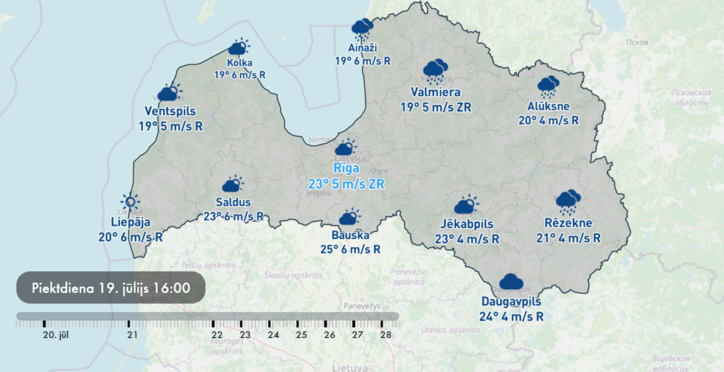 Rīgā brīžiem uzspīdēs saule, bet pēcpusdienā iespējams īslaicīgs lietus. Saglabāsies lēns līdz mērens rietumu puses vējš, un maksimālā gaisa temperatūra būs +21…+23 grādi.