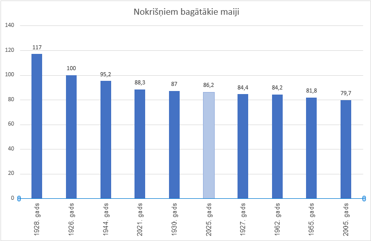 LVĢMC norāda, lai gan nokrišņu ir bijis daudz, vēsturiski šī gada maijs pēc mitruma ierindojas tikai sestajā vietā. Pirmajā vietā ir 1928. gada maijs, kad vidējais nokrišņu daudzums valstī bija 117 mm, otrajā vietā 1926. gada maijs ar 100 mm, bet trešajā – 1944. gada maijs ar 95,2 mm. Maija vidēja nokrišņu daudzuma norma Latvijā ir 50,4 mm.