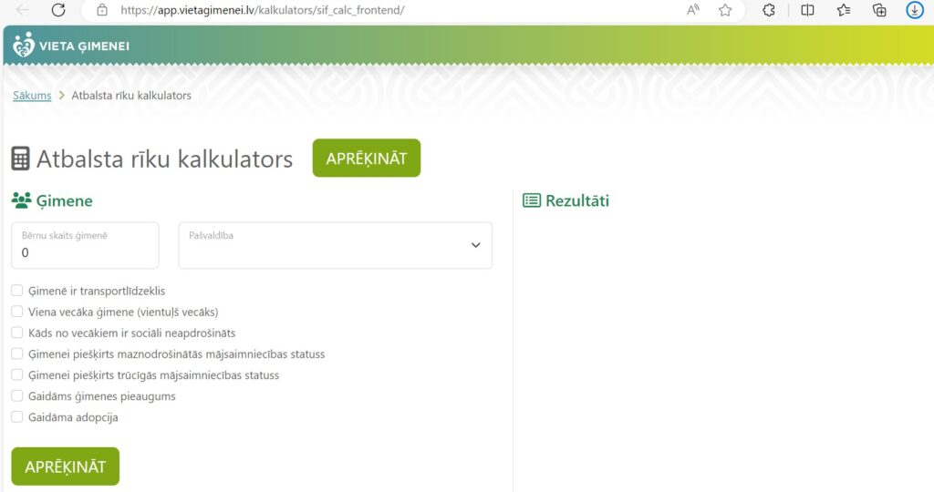 Atbalsta rīku kalkulators, kas atrodams tīmekļvietnē “vietagimenei.lv”, izveidots, lai palīdzētu iedzīvotājiem ātri un ērti uzzināt par ģimenēm pieejamo valsts un pašvaldību sniegto atbalstu. SIF izstrādātais rīks sniedz iespēju vienkopus redzēt mērķēto valsts un pašvaldību atbalstu dažādām iedzīvotāju grupām, kā arī modelēt situācijas, ja tiek plānots ģimenes pieaugums, lai jau laikus varētu noskaidrot pieejamo pakalpojumu grozu. Pieejamos datus par atbalsta iespējām aktualizē un norāda katra pašvaldība individuāli.