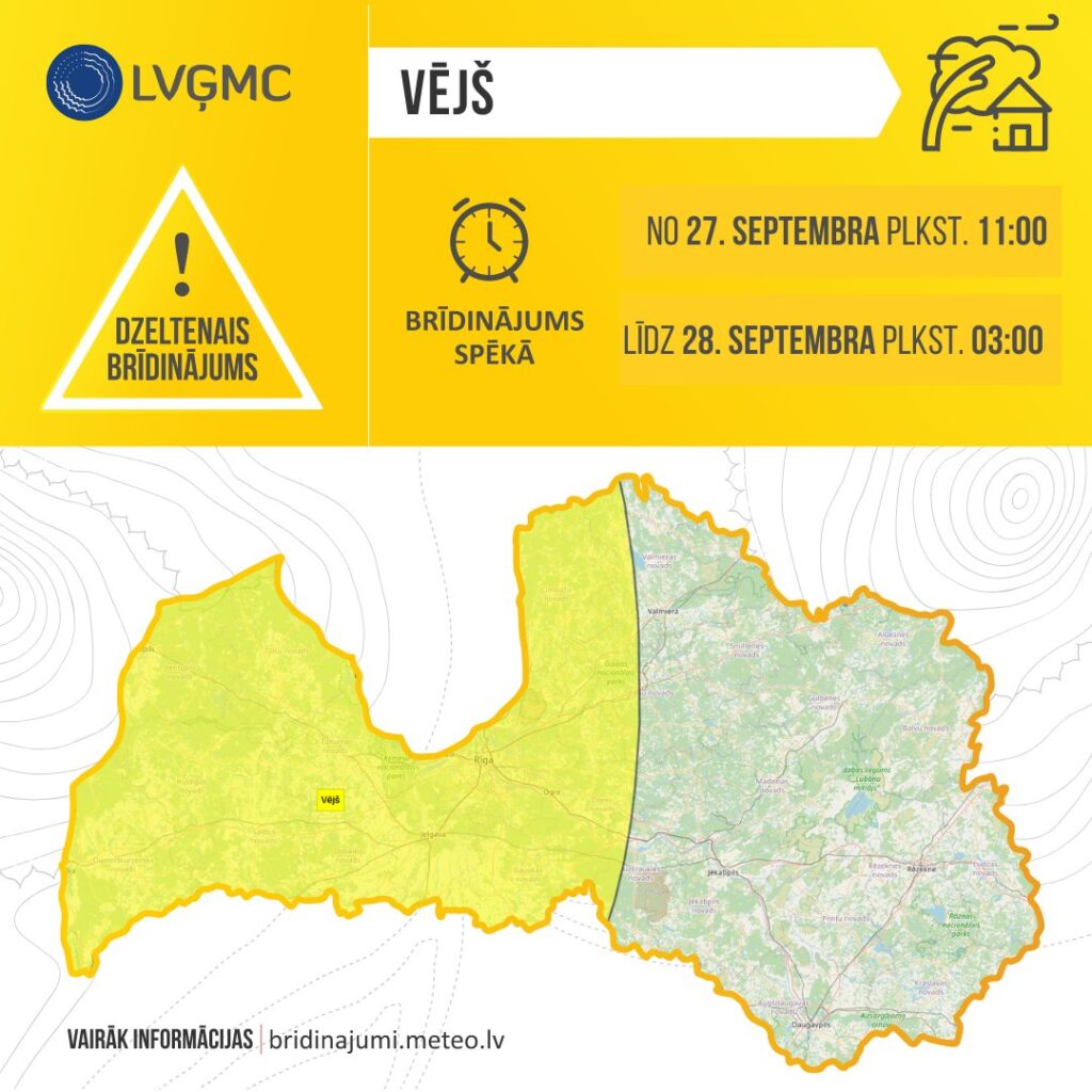 Valsts rietumu un centrālajos novados Latvijas Vides, ģeoloģijas un meteoroloģijas centrs izsludinājis dzeltenās pakāpes brīdinājumu par stipru vēju, kas var lauzt koku zarus un radīt citus nelielus postījumus.