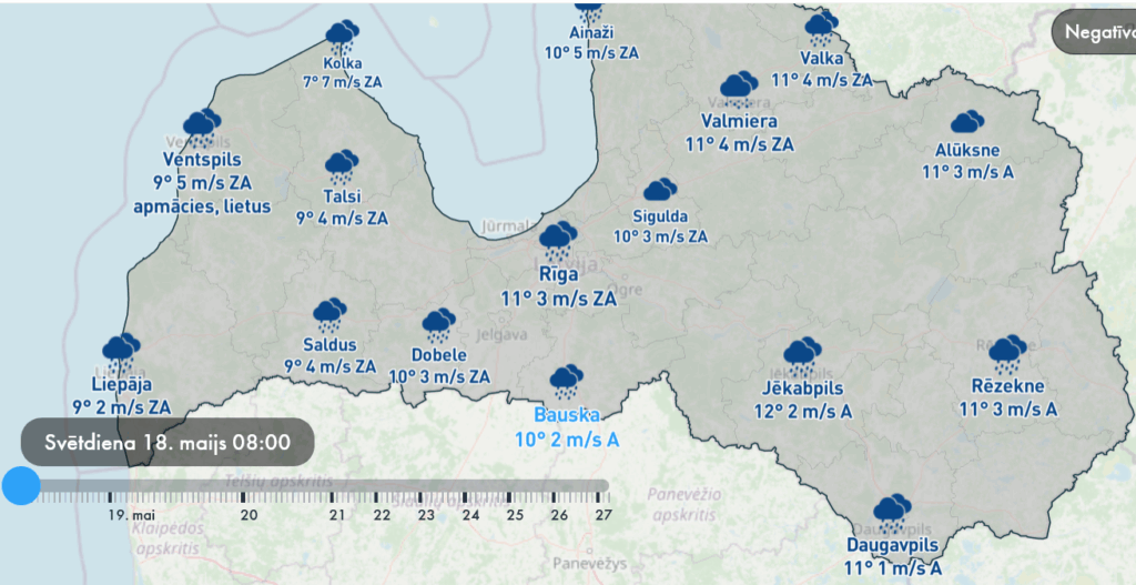 Rīgā mākoņains laiks, un palaikam līs. Pūtīs lēns līdz mērens ziemeļaustrumu, ziemeļu vējš. Maksimālā gaisa temperatūra būs +12…+14°.