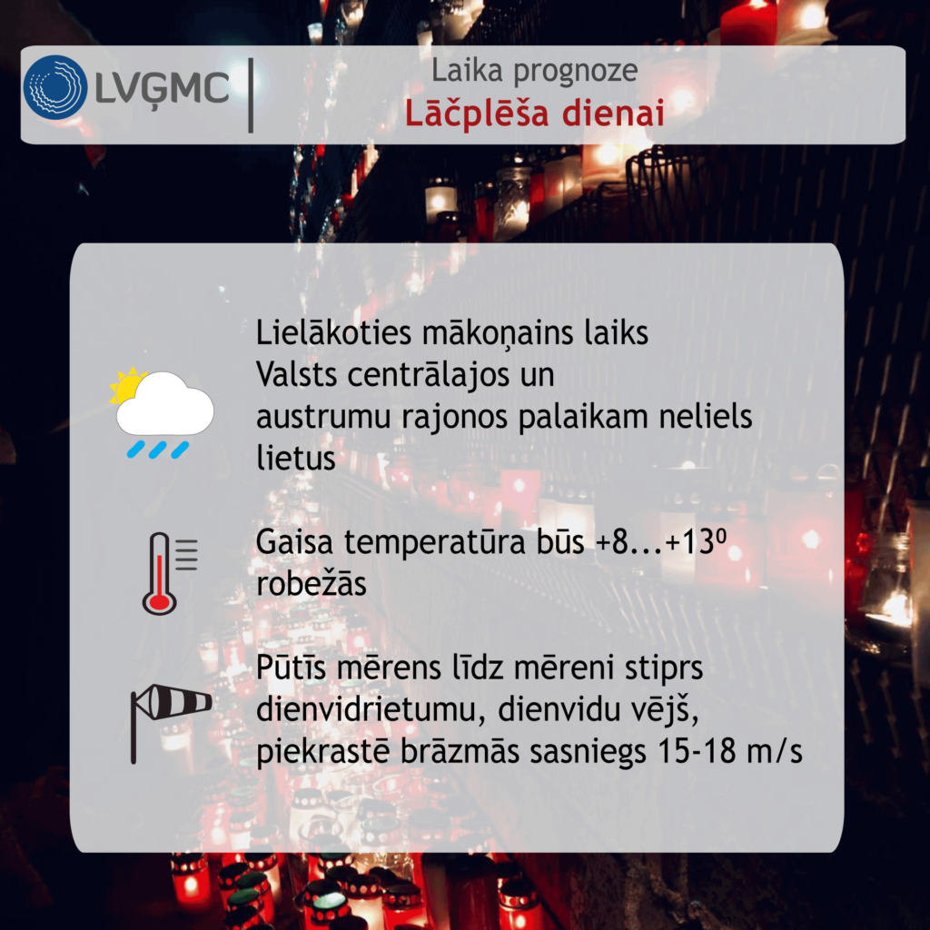 Šogad, 11.novembrī, Latvijā gaidāms apmācies, vējains un silts laiks, vietām nedaudz līs, prognozē sinoptiķi.