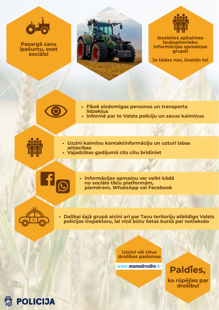 Šajā laikā četros gadījumos nozagta pati traktortehnika, tāpat reģistrēti daži gadījumi, kad nozagtas traktortehnikas detaļas. Lai pasargātu savu smago tehniku no zagļiem, Valsts policija saimniekus aicina parūpēties par tās drošību! Tostarp uzturēt labas attiecības ar apkārtnes iedzīvotājiem, kas atvieglo informācijas apmaiņu, un pievērst pastiprinātu uzmanību aizdomīgām personām, kurām varētu būt noziedzīgi nolūki, un par tām nekavējoties ziņot policijai, «Bauskas Dzīvi» informē Valsts policijas sabiedrisko attiecību nodaļas vecākā speciāliste Gita Gžibovska.